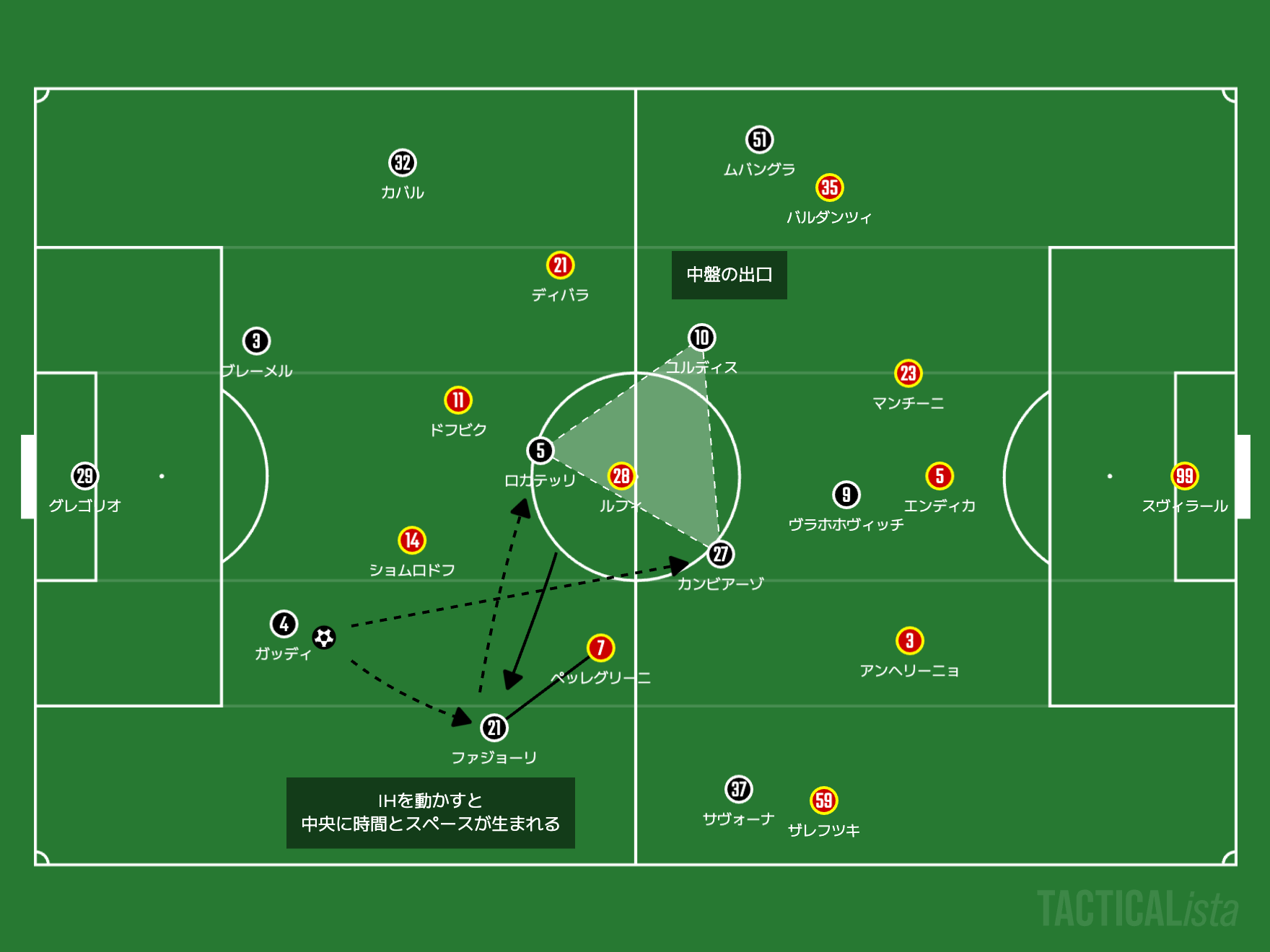 ユベントスは右SBのサヴォーナが大外を取ることがほとんどです。彼が大外の住人となることで、内側にカンビアーゾを押し込みます。これを行うことによってカンビアーゾが自由を得ることができるのですが、整合性を保っているのがCHのファジョーリとロカテッリです。ではどのようにバランスを保っているのでしょうか。