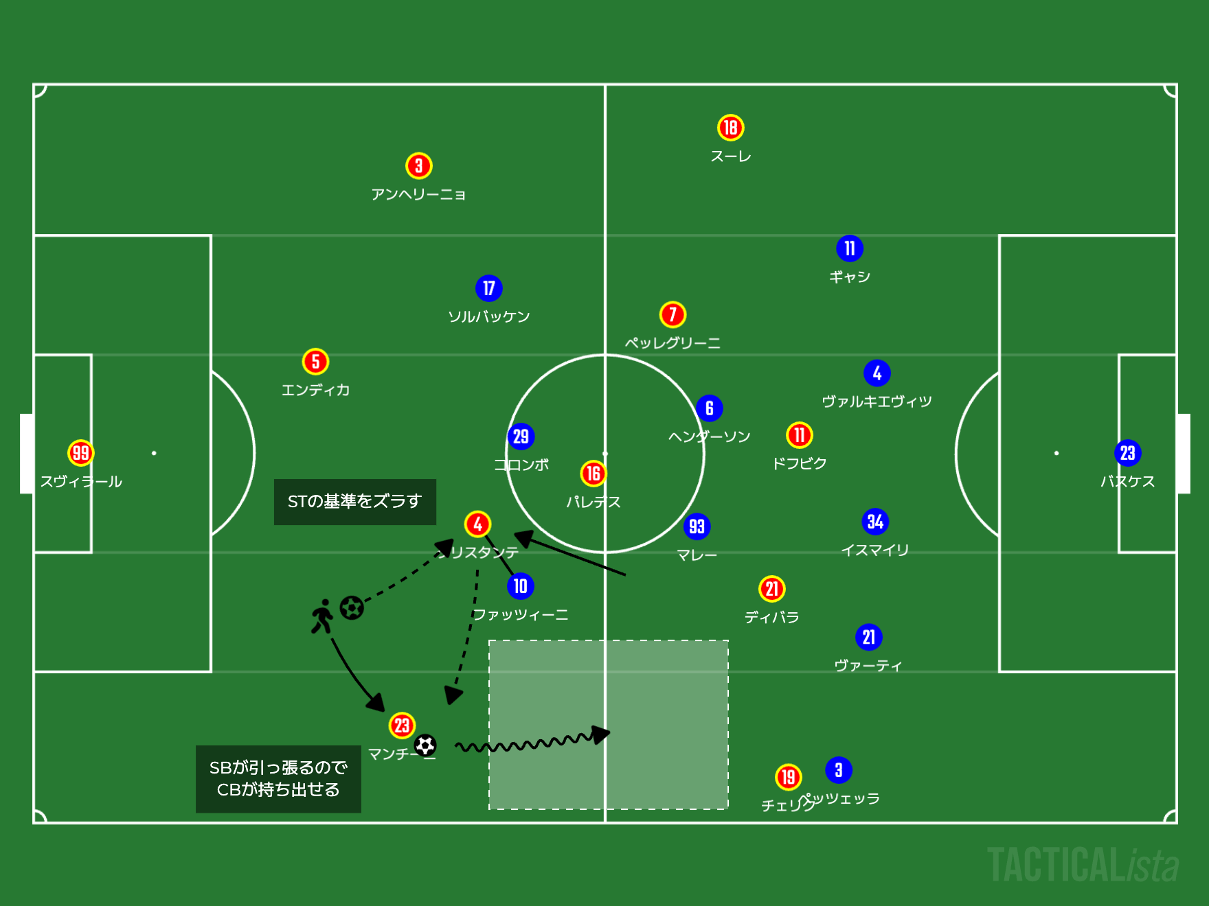 まず最も行われるのが3バック化です。開幕戦、第2節と共に、もっというと昨季から4321もしくは4123で可変を行うことがローマはほとんどでした。そして今季もそれを継続しています。その際にアンへリーニョが3CB化することで、CHもしくはIHの選手が1stプレスラインの基準をずらしていきます。これでマンチーニの持ち出しを促していくことが多いのがローマで、このためにSBが高い位置を取ってスペースを創出します。そしてこれによってディバラが中央でプレーすることが可能になっていきます。