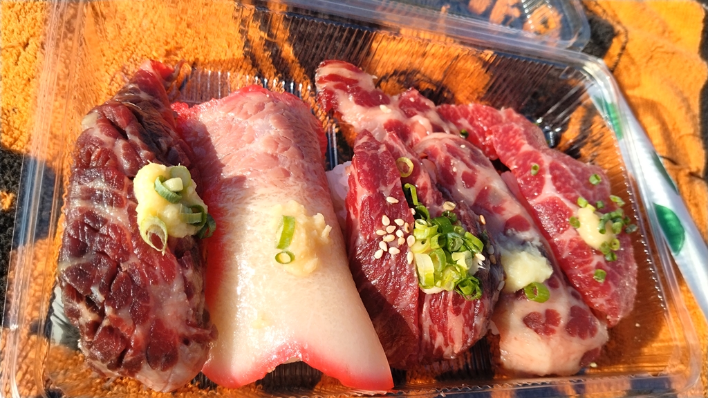 唐戸市場での二品目は下関ならではのお寿司です。左から、クジラのかまとろ300円、クジラベーコン200円、生クジラ400円、カノコ400円、クジラの尾の身400円でした。