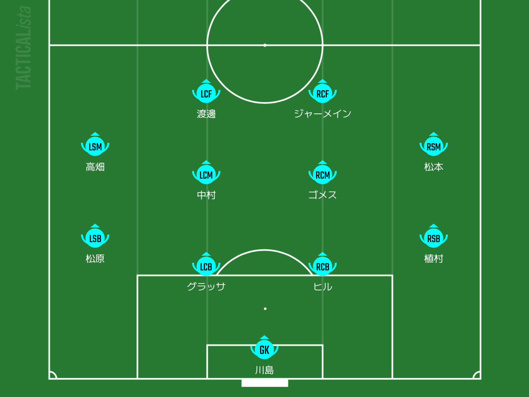 また4バックのチームと戦う場合、WBとSTの配置的な優位性を使いながら攻撃を仕掛けることができています。エースのレオ・セアラへのボールの届け方もスムーズになっていて、残留に向けて難しい一戦となることは間違いありません。