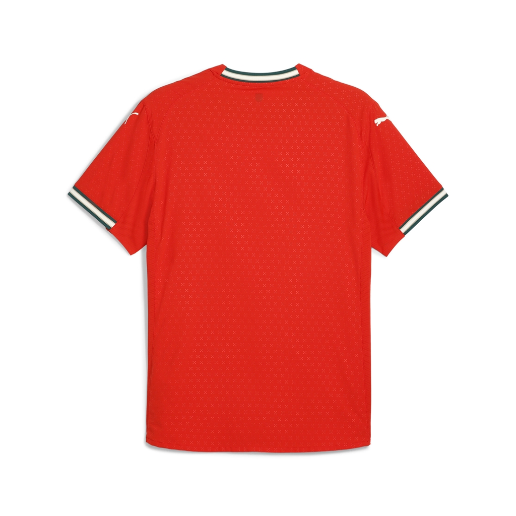 特徴的なポルトガルカラーであるレッドをベースに、グリーンとゴールドが美しいコントラストを生み出し、見る人を魅了するカラーリングとクルーネックの襟が特徴だ。