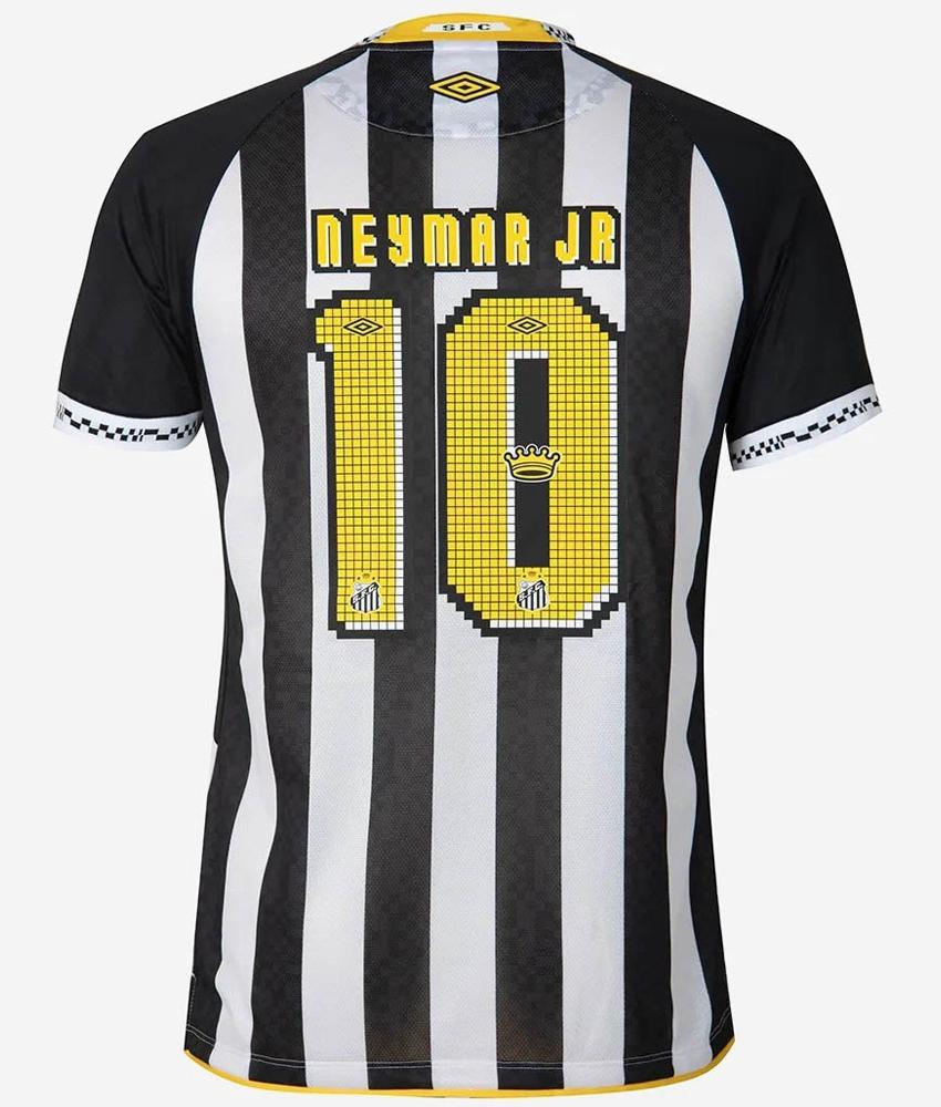 話題多き今季のサントスが着用する新アウェイユニフォームは、ホワイトとブラックの鉄板ストライプに。ファンの期待を裏切らない王道デザインだが、ピクセル柄のグラフィックは意外性があり実に面白い。