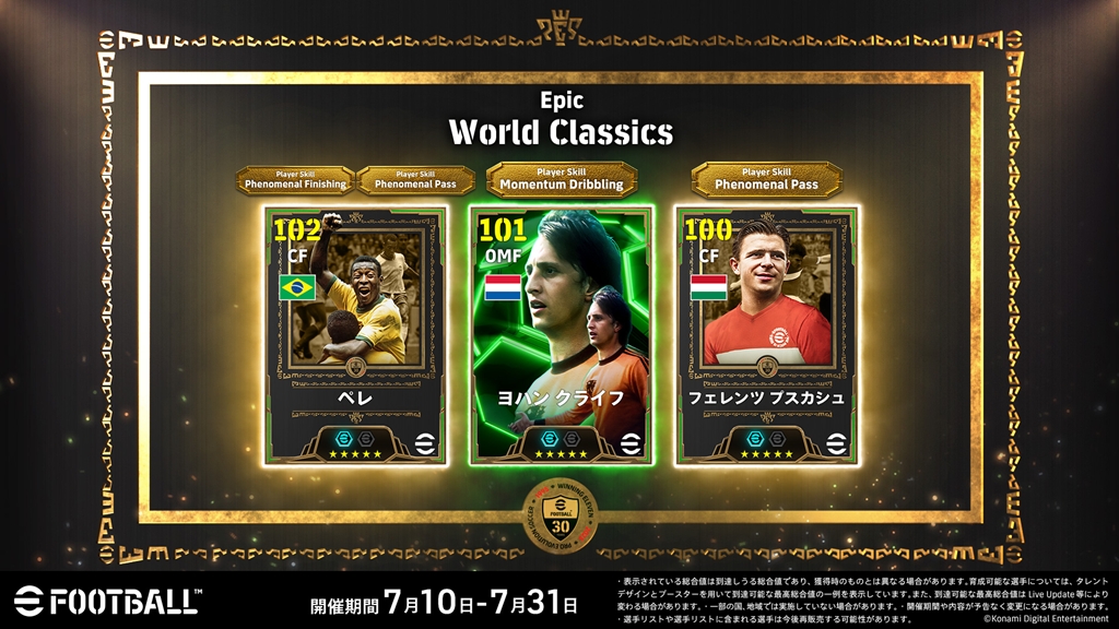 「Epic:ヨハン クライフ」、「Epic:フェレンツ プスカシュ」とともに降臨する、初登場の「Epic:ペレ」は、特殊スキルである「フェノミナルフィニッシュ」、「フェノミナルパス」を2つ所持している初めての選手とのこと。