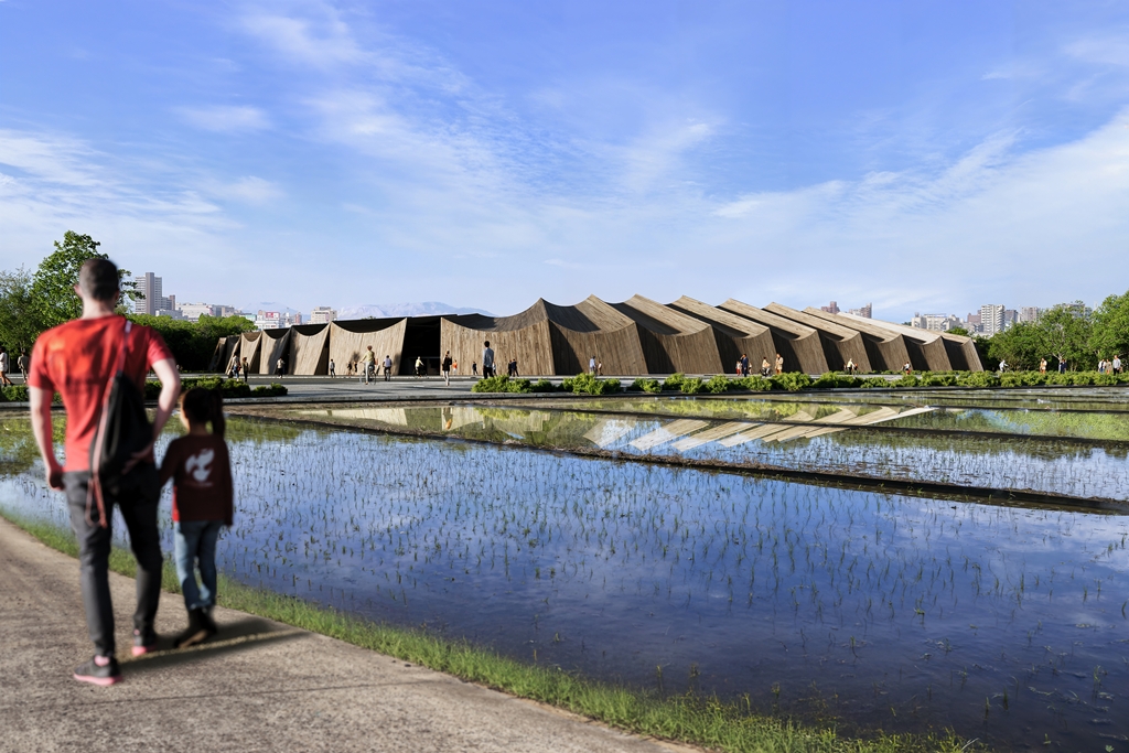 日本発のサステナブル建築を模索するにあたり、日本の伝統である「式年遷宮」から着想を得て、木造を採用し、福島県産の製材を積層することで全体を形成。各部品は分解、再利用できる設計とし、地域資源の循環を推進する。
