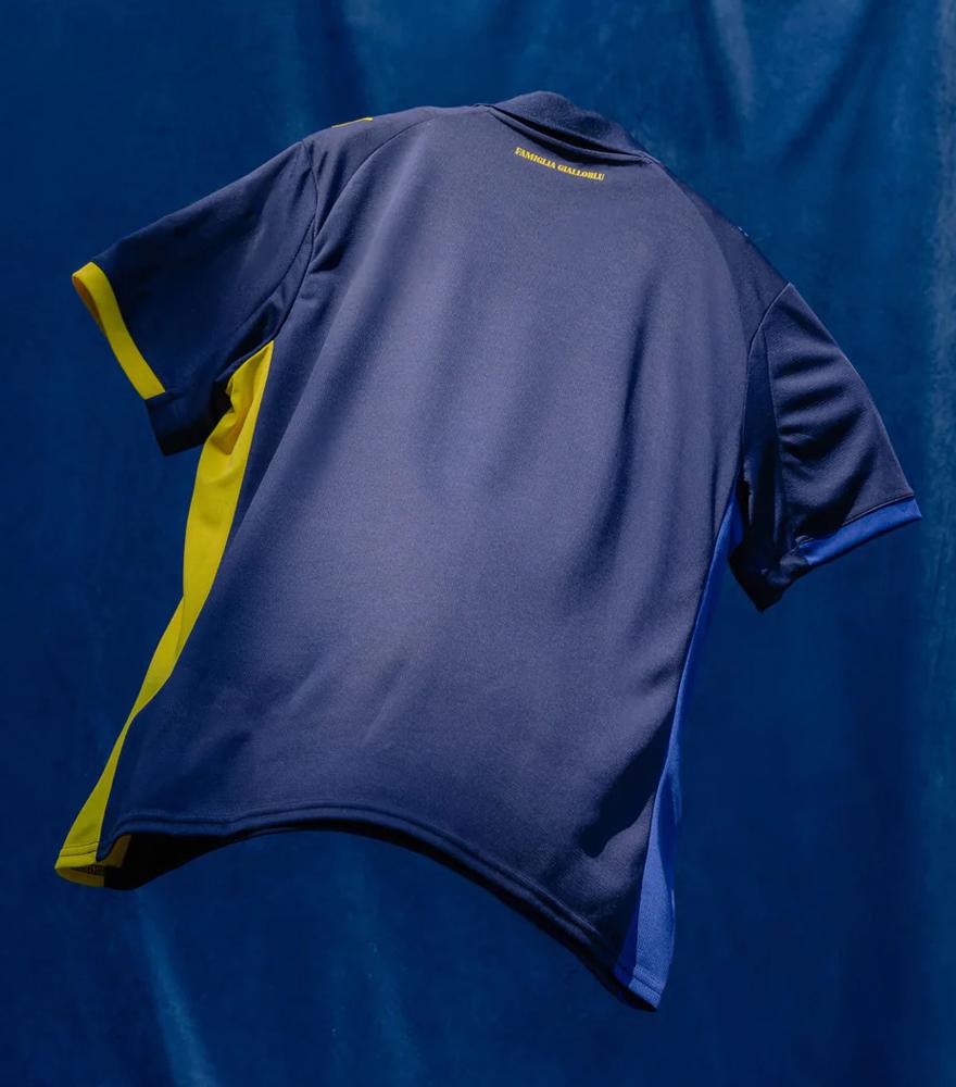 背面の首元に“Famiglia Gialloblu”をレタリングする。チームの愛称“Gialloblu”(ジャッロブルー/黄と青)は、地元パルマの旗・紋章の色でありクラブカラー。チームやサポーターはファミリーだと強調する言葉だ。