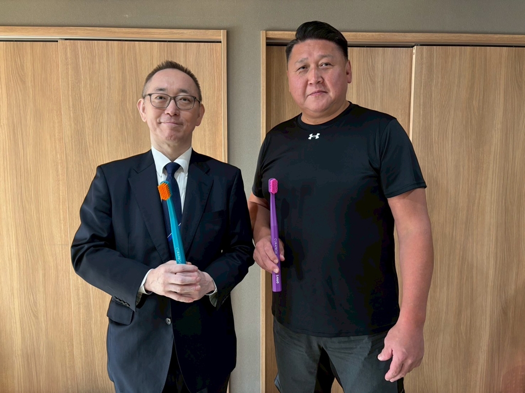 当日は、クラデンジャパンの池亀友社長より、スイス発の高級歯ブラシ「CURAPROX(クラプロックス)」100本が力士たちに贈呈されたという。