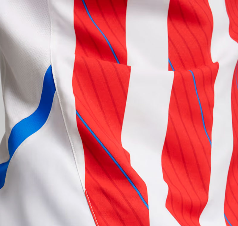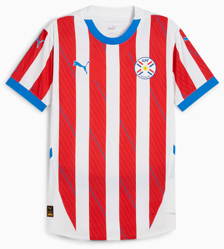 2024年6月に発表された現在のホームユニフォームは、レッドとホワイトのストライプにブルーの差し色を合わせた、パラグアイらしい伝統的なデザイン。