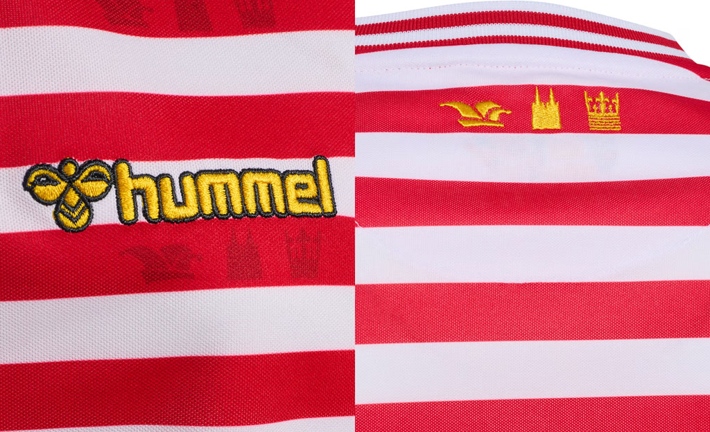 そんなカーニバルのユニフォームで欠かせないのが、3つのアイコン「道化師(ピエロ)の帽子」、「ケルン大聖堂」、「市の紋章の王冠」だ。背面の首元にこの3つを刺繍で施し、シャツの透かし模様にも採用。カーニバルならではの特別な雰囲気を演出する。