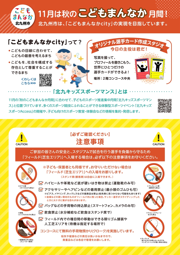 A. スタンド席(観客席)は服装自由ですが、フィールド(芝生エリア)に入られる場合は、親子ともに、運動靴が必須です。ヒールや革靴ではフィールドに入れませ 。また、フィールドの安全確保のため、アクセサリーやヘアピンなど硬い装飾品も外していただきます。